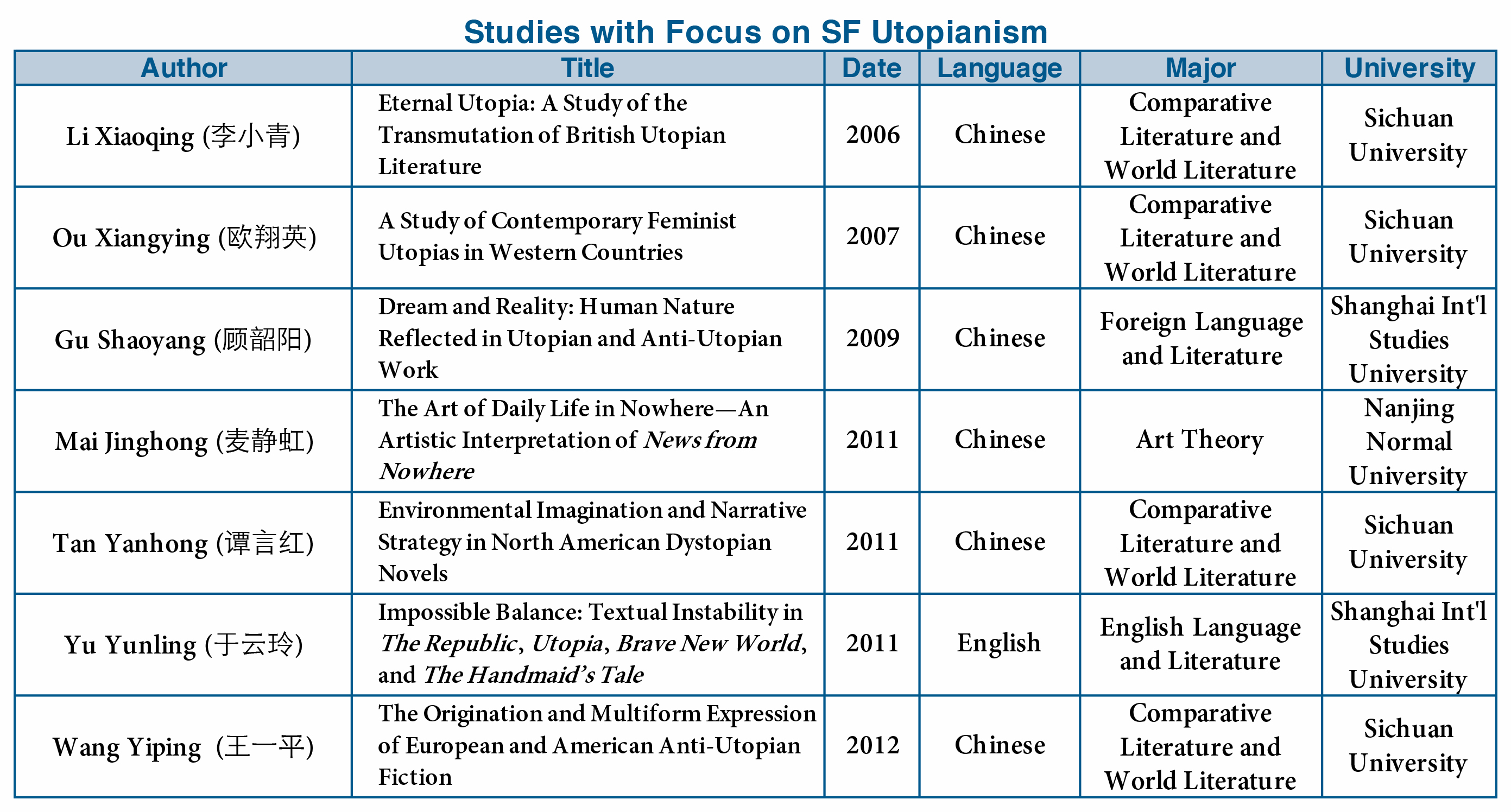As Sargent identifies the three broad directions of utopianism as “utopian thought or philosophy, utopian literature, and the communitarian movements”(222), a lot of dissertations with the keyword utopia are theoretical studies of utopian philosophy, and even the literary study of Utopian Thought in Some British and American Fiction (2008) by Niu Hongying (牛红英) is actually a study of utopian thought in some classical non-sf writers, and thus they are not included in Table 2. Mai Jinghong’s dissertation, though included in the table, has weak relevancy to sf, as it interprets Morris’s work as a daily artistic theory.