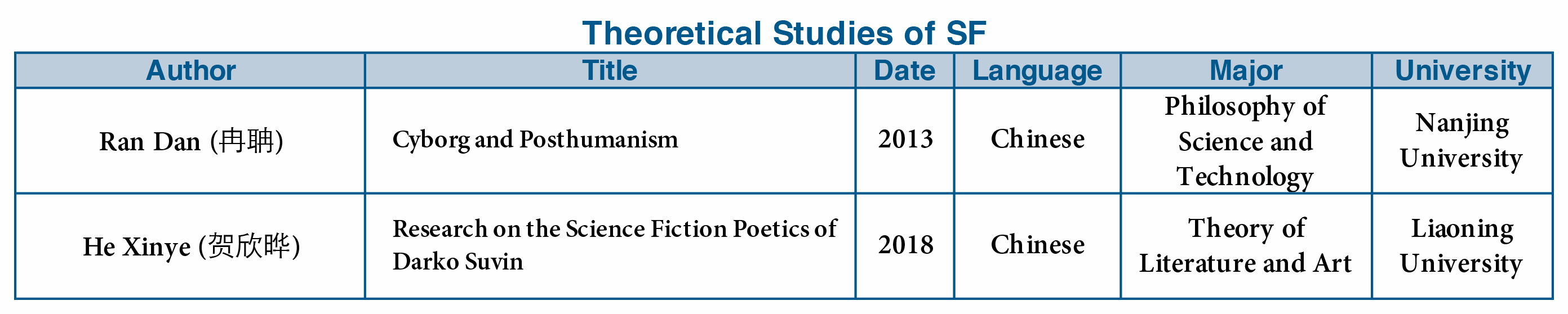 In globalized sf culture, sf in English has been dominant ever since the birth of modern sf in the 19th century. As a popular genre, sf development relies heavily and inevitably upon the marketplace, where academic studies would help explore and establish the values obscured by commercial shrouds. In the field of English-language sf study, Chinese scholars have published numerous significant papers, many of which are extracted or extended from their doctoral dissertations, which have got or would be published in book form, constituting in turn the major part of the book publishing in this field. And in terms of academic strength, in China Master’s theses are incomparable to doctoral dissertations, due to their different program requirements. The brief review of this paper thus focuses on doctoral dissertations, together with relevant academic books, as they stand out not only as crystallization of existing relevant research interests, but representing the most comprehensive and highest level of standards.