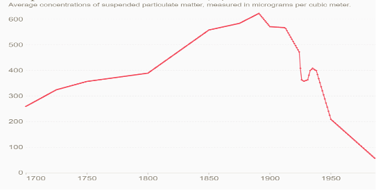 The years from 1820 to 1900 saw a rapid increase in British coal consumption. It rose from 20 million tons in 1820 to 160 million tons in 1900 (an eight-fold increase) (Fouquet, 2011, pp. 2380-2386). Severe timber shortages in the early 1800s drove a crisis-driven shift from wood to coal in home heating, cooking, iron production, and steam production. A half ton of coal produced four times as much energy as the same amount of wood and was cheaper to produce as timber became rare. Despite coal’s bulk, it was easier to distribute. The switch to coal averted an energy crisis but ushered in a pollution crisis. Figure 1 shows the dramatic rise in pollution in the 1800s.