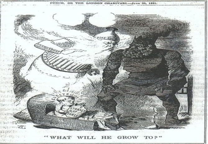 The age of Verne was dominated by coal. Victorians at first saw coal as a boundless energy source, albeit a dirty one. Verne framed an entire novel, The Underground City, in 1877 to discuss the coal mining industry. He highlighted the use of coal in steel and ironmaking in his novels Begum’s Millions (1879) and Mysterious Island (1875).