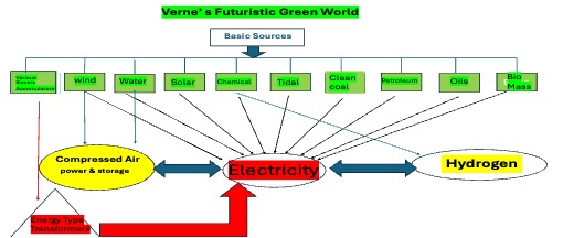 Verne’s energy predictions and insights in Paris in the 20th Century (1863) laid the foundation for the literary future of energy in Verne’s world and beyond. This 50-year literary history (1863 to 1919) of energy by Verne was at times indeed a series of green adventures extraordinaire. His literary series adventures (Voyages Extraordinaire) would cover and improve upon an array of futuristic energy predictions such as compressed air rapid transit, hydrogen-fueled vehicle engines, new efficient electrical and electromagnetic applications, more powerful sodium batteries, wind power, hydroelectric power, solar power, tidal power, static electricity air accumulators, x-rays, wireless communications, laser beams, petroleum fuels, and new electro-mechanical machines, and new types of efficient engines to replace the steam engine—even some unfilled dreams such as electrical generation from ocean thermal gradients.